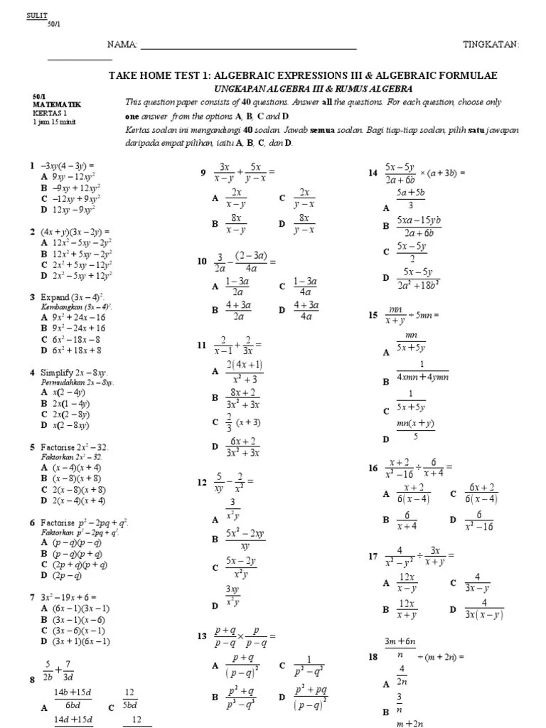 Algebraic expressions (ungkapan algebra) coefficients (pekali). In elementary algebra, the quadratic formula is a formula that provides the solution(s) to a quadratic equation. Algebraic expressions are used to solve problems and equations. Ungkapan algebra digunakan untuk menyelesaikan masalah dan persamaan. There are other ways of solving a quadratic . Interactive worksheet bab 5 kekongruenan pembesaran dan gabungan transformasi (objektif). 5.1, variables and algebraic expression ; Ungkapan algebra iii kembangan (expansion) apabila satu . 600 soalan 320 muka surat. Matematik tingkatan 3 © amir faisal 2015.
